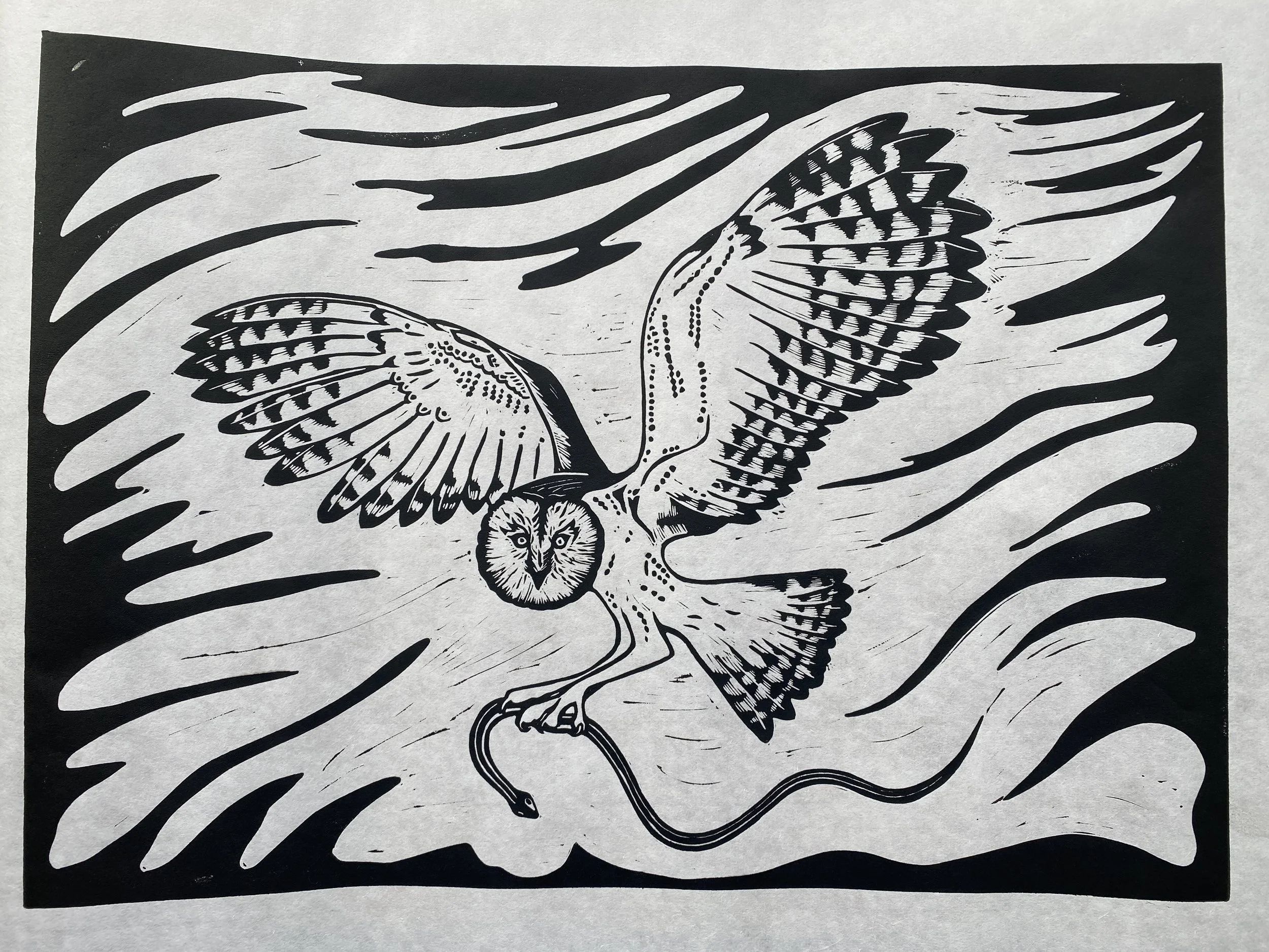The concept for the owl and snake relief print has been with me for a while. Last summer we noticed an abundance of snakes around our house (which makes sense as we live in a wetland) but they were really making themselves seen. One snake often basked on our front deck right underneath our door, and would even come there to shed- so occasionally we would find a snake skin waiting for us right at the doorstep.